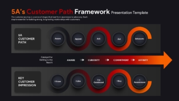 The 5A’s Customer Path Framework presentation template is a visual slide layout designed to present the customer journey from initial awareness to long-term advocacy. This template uses a horizontal, flow-based structure to show how customer perception and behavior progress across connected stages. It helps presenters clearly communicate how audiences move through awareness, interest, evaluation, action, and recommendation over time. The slide design supports strategic discussions by aligning customer actions with corresponding mindset shifts. This template is suitable for mapping customer touchpoints, internal alignment discussions, and high-level journey presentations. It is commonly used in marketing, growth, and customer experience presentations. The layout is structured for clarity, making it suitable for executive and stakeholder audiences. The template is fully editable in PowerPoint and Google Slides. It is intended for professional presentations that require a clear and structured customer journey view.