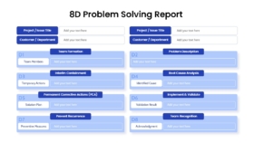 The 8D Problem Solving Report Template is a structured presentation slide designed to document and communicate corrective action processes in a clear and organized format. The template includes sections for project details, team formation, problem description, interim containment, root cause analysis, corrective actions, validation, prevention, and team recognition. Each discipline (D1–D8) is clearly separated, allowing teams to record findings and decisions in a standardized structure. This template helps organizations present problem resolution progress in a formal and traceable manner. It is suitable for quality management reviews, manufacturing issue reports, supplier communication, and internal audits. The format supports structured documentation while remaining adaptable for different industries. Designed for PowerPoint and Google Slides, it allows teams to present investigation results and corrective actions during meetings or reporting sessions. It works as a standalone report slide or as part of a broader operational presentation template.