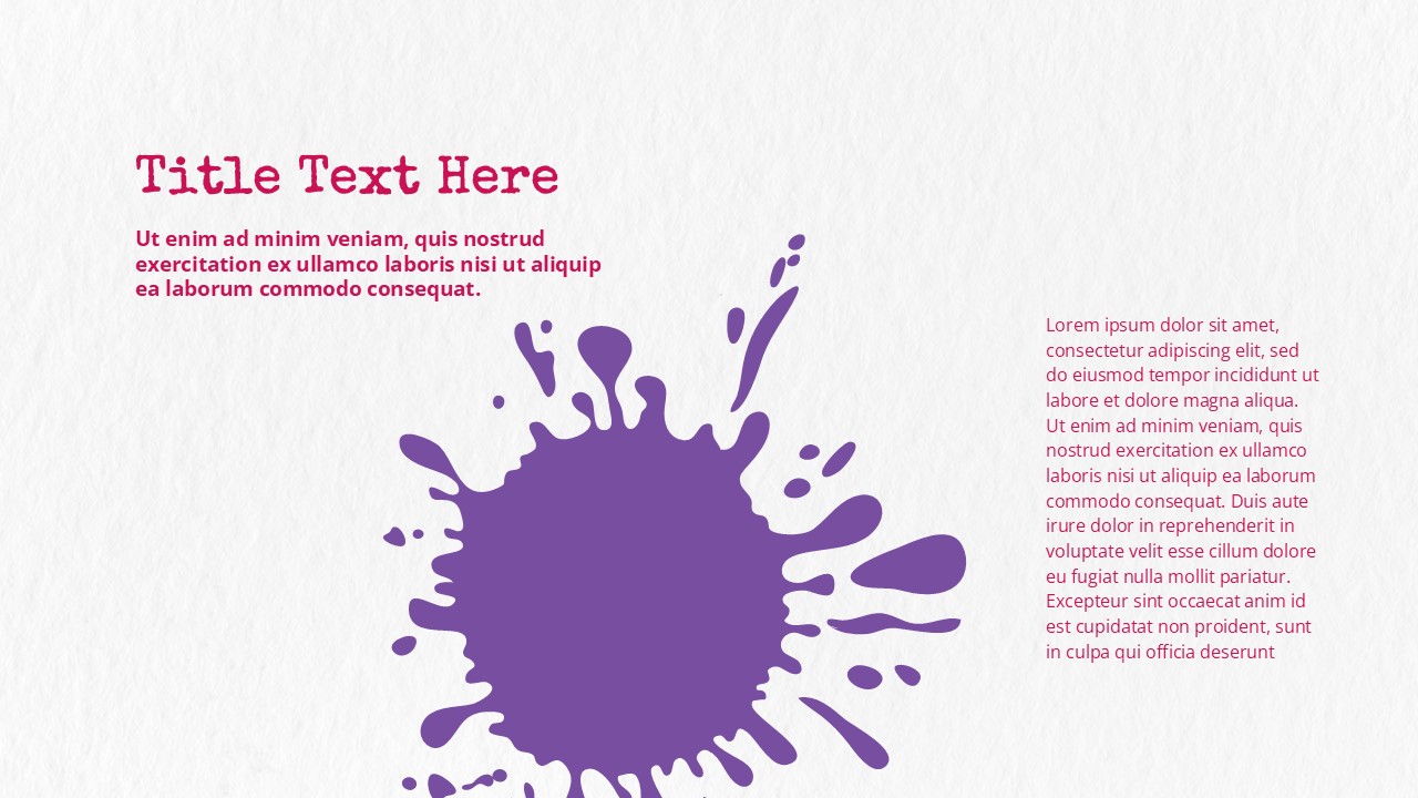 These art presentation templates are ideal for a wide range of purposes. They work wonderfully for creative fields, such as art exhibitions, fashion presentations, and design projects. Artists, gallery owners, and creative agencies can use them to present their work in a visually engaging way that enhances their artistic message. Furthermore, the vibrant colors and splattered design make it a great choice for marketing pitches, startup presentations, and product launches in industries that focus on creativity and innovation.
