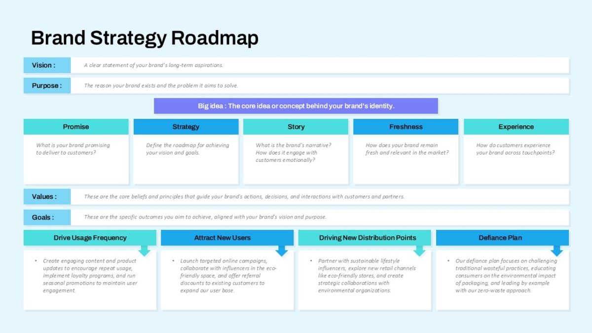 This roadmap slide template also includes tactical guidance at the bottom level, offering predefined strategies such as driving usage frequency, attracting new users, expanding distribution points, and establishing a defiance plan—perfect for brands seeking to challenge conventional norms or lead with purpose.