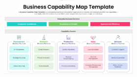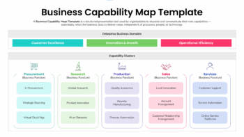 The Business Capability Map Template is a professional presentation tool designed to help organizations visualize, align, and communicate their core capabilities with clarity. This template serves as a structured framework for mapping out what a business does to deliver value, independent of processes, people, or technology. By presenting capabilities in a simple, visually engaging format, it allows teams to identify strengths, gaps, and opportunities across different business domains.