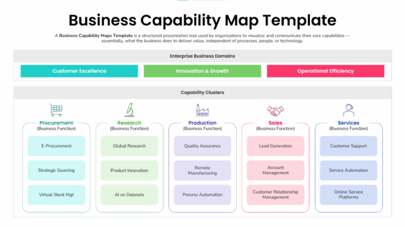 This template is organized into three major enterprise business domains: Customer Excellence, Innovation & Growth, and Operational Efficiency. Each domain is further broken into capability clusters, highlighting the essential functions that support business success. The clusters include Procurement, Research, Production, Sales, and Services, each mapped with specific sub-capabilities such as e-procurement, product innovation, process automation, customer relationship management, and service automation.