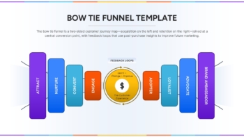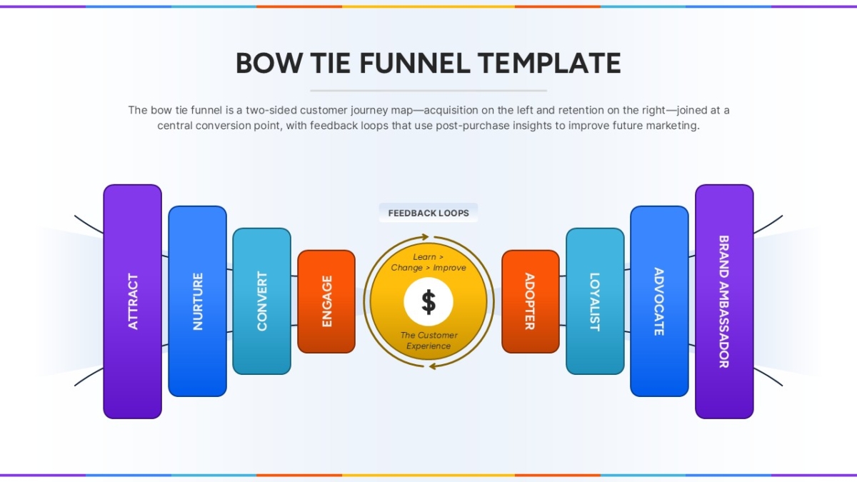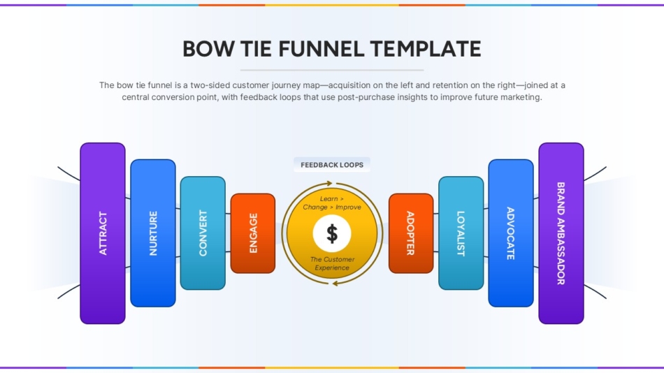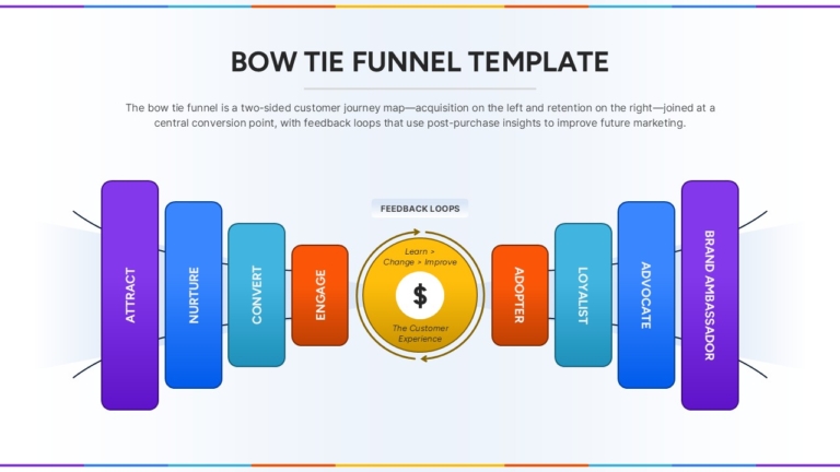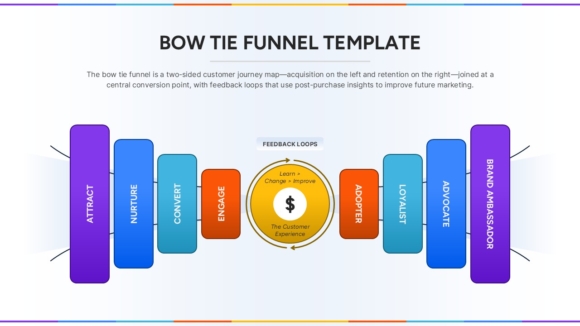 This Bow Tie Funnel slide offers a dynamic visualization of the full customer lifecycle—from acquisition to retention. Designed as a two-sided customer journey model, the funnel begins with three left-side stages (Attract, Nurture, Convert) representing acquisition efforts. At the center is a feedback-driven engagement hub focused on customer experience improvement, flanked by five right-side stages (Adopter, Loyalist, Advocate, Brand Ambassador) to illustrate long-term retention and brand growth. Each phase is color-coded and arranged in a symmetrical layout resembling a bow tie, which visually guides viewers through the full funnel narrative.