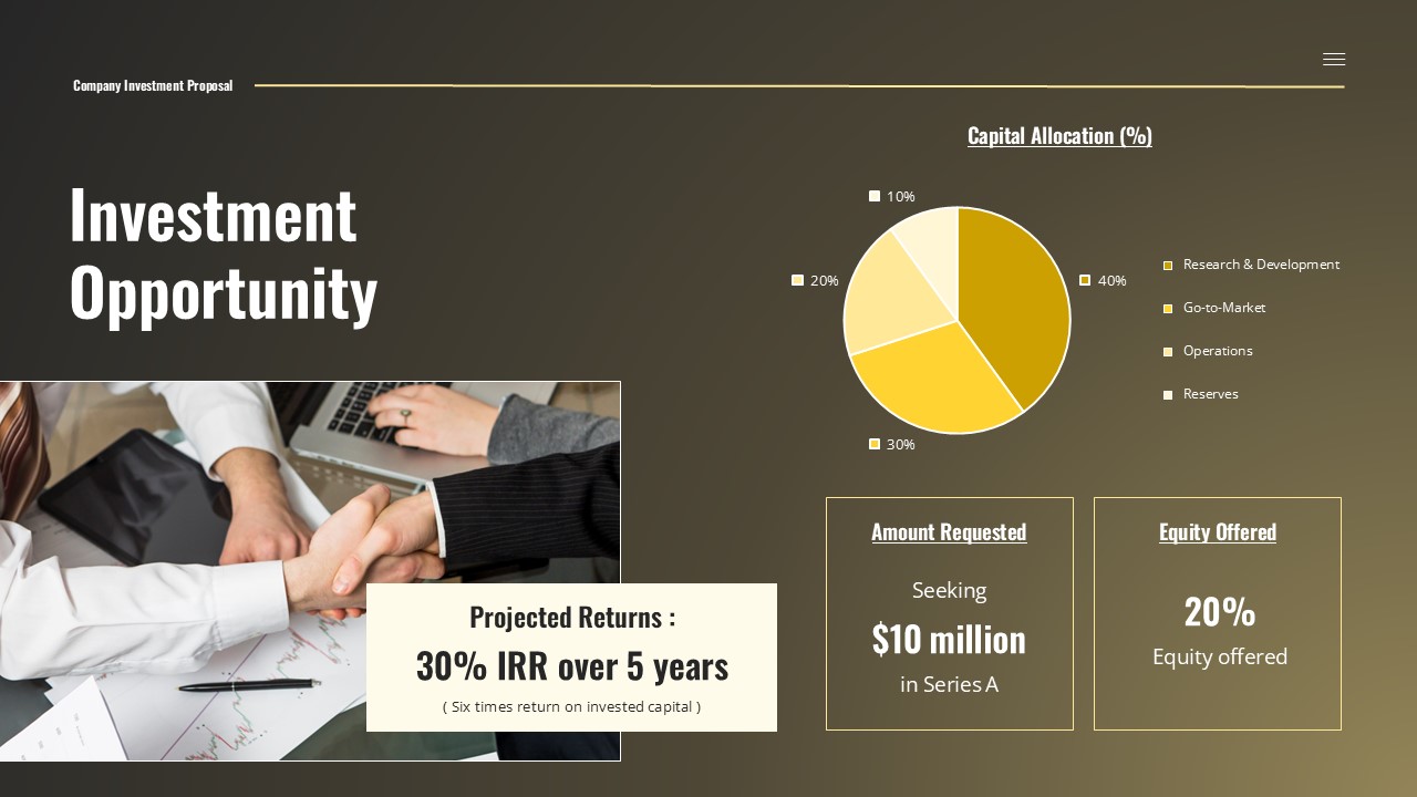 The Company Investment Proposal Presentation Template is designed for business professionals who want to present their proposals in a structured format. It works on both PowerPoint and Google Slides. The deck uses a mix of dark and light backgrounds, with a color palette combining brown tones and yellow shades in gradient transitions. This color combination helps create a visual flow between sections and highlight data points.