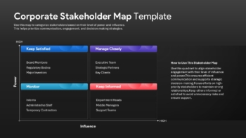 This structured approach allows businesses to strengthen relationships with key players, reduce risks, and ensure smoother decision-making processes. Whether used in corporate strategy meetings, project planning sessions, or stakeholder communication workshops, this template helps presenters visualize relationships in a clear and engaging way.
