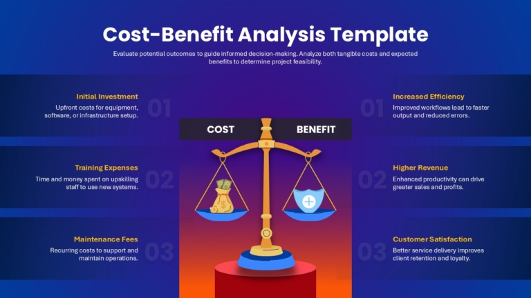 At the center of the design is a symbolic weighing scale, representing the balance between costs and benefits—providing a clear, impactful way to present decision-making insights. On one side, key costs such as initial investment, training expenses, and maintenance fees are outlined. On the other, benefits including increased efficiency, higher revenue, and customer satisfaction are highlighted, helping stakeholders visualize trade-offs at a glance.