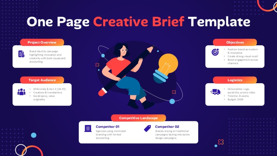This template is perfect for marketers, creative agencies, project managers, startups, and business professionals who need to present campaign strategies, project briefs, or creative concepts in a concise and visually compelling format.