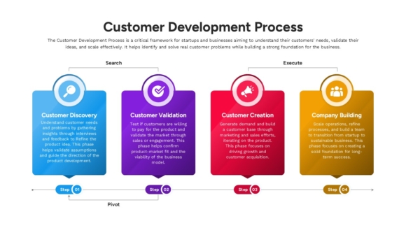 With its horizontal process flow and step-based structure, the template is particularly effective for workshops, investor pitches, internal strategy meetings, and educational sessions. It enables presenters to demonstrate how customer insights influence product direction, how market fit is validated, and how growth strategies evolve over time. Rather than focusing on isolated actions, the template highlights the interconnected nature of customer research, validation, and execution.