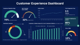 The dashboard layout features essential KPIs such as Customer Retention Rate, Net Promoter Score (NPS), Customer Satisfaction Score (CSAT), Churn Rate, and First Response Time. In addition, it showcases a detailed Sentiment Analysis and tracks Customer Lifetime Value (CLV) alongside Active Users over a 12-month period. These visual components enable stakeholders to make data-driven decisions at a glance, streamlining customer experience strategies with measurable insights.