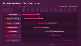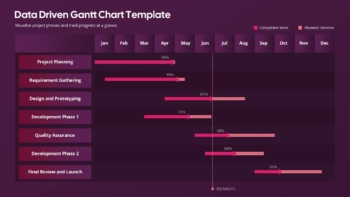 The Data Driven Gantt Chart Presentation Template is a professional and visually engaging tool designed to simplify project management and timeline tracking. By combining structured layouts with progress visualization, this template allows teams to clearly present project phases, milestones, and completion status in a single view.