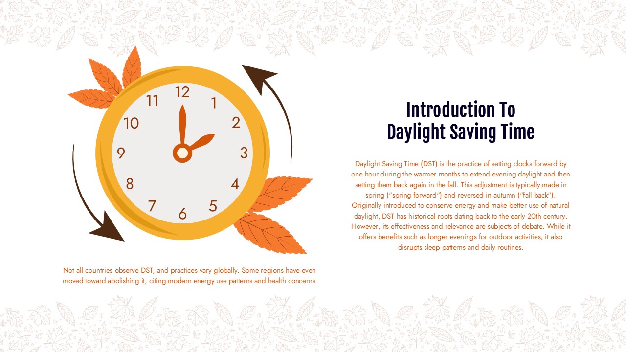 For professionals, educators, and business leaders, presenting the intricate details of DST and its implications has never been easier. The Daylight Saving Time Ends PowerPoint Presentation is designed to offer a comprehensive and visually appealing way to explore this fascinating topic.