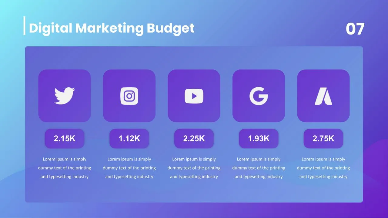 The Digital Marketing Presentation Slide Deck comprised 20 slides for online business marketing. It contains high-quality picture perfections with digital marketing themes. The informative template could assist marketing agencies and media in promoting their services. The users can create company profiles or portfolio presentations using graphical representations. Blue halftone mix combination ensures audience attraction to the digital marketing presentation templates.It is a perfect design for digital marketing companies to add their services with budget allocations—for example, social media marketing and video marketing services with budgets. Using Digital Marketing Slides can help you easily communicate your ideas and professionally present your work. The Digital Marketing Proposal Template contains modern graphics, cutout images, and attractive duotone backgrounds in a sequential flow. Besides, it includes creative design layouts such as data charts, timelines, and tables. The organized structure of Digital Marketing Strategy Presentation lets users create full-fledged business introduction presentations or present digital marketing trends in 2023 with 100% editable Google Slides.