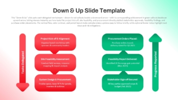 This Down & Up Slide Template is a ready-to-use presentation slide that compares tasks and outcomes in a single layout. It organizes assigned tasks in a downward flow while showing achievements in an upward flow. This design helps presenters demonstrate how project activities lead to measurable results. The layout also highlights important milestones and completed actions. As a result, audiences can quickly understand the relationship between planning and progress.
