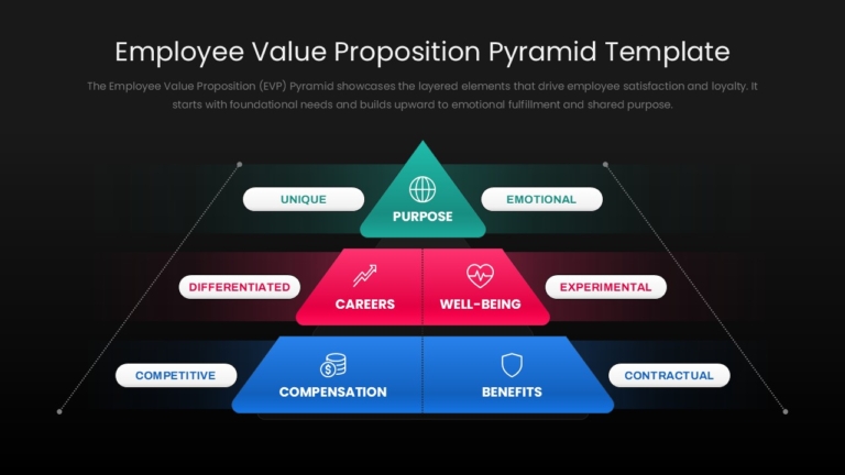 The Employee Value Proposition (EVP) Pyramid Template is a visually compelling tool designed to articulate the multi-layered components that contribute to employee satisfaction, engagement, and long-term retention. This structured pyramid model enables organizations to communicate the core values, benefits, and emotional connections that form the foundation of their employer brand.