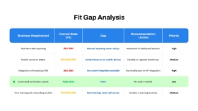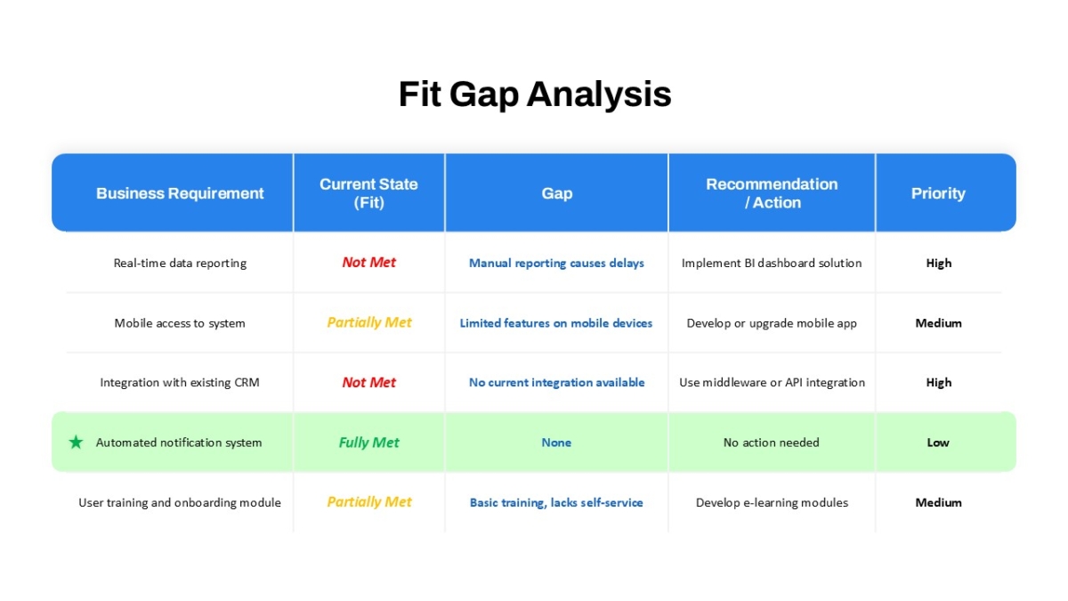 - Current State (Fit) Column: Provides a clear status of the current state (e.g., Not Met, Partially Met, Fully Met) for each business requirement.
