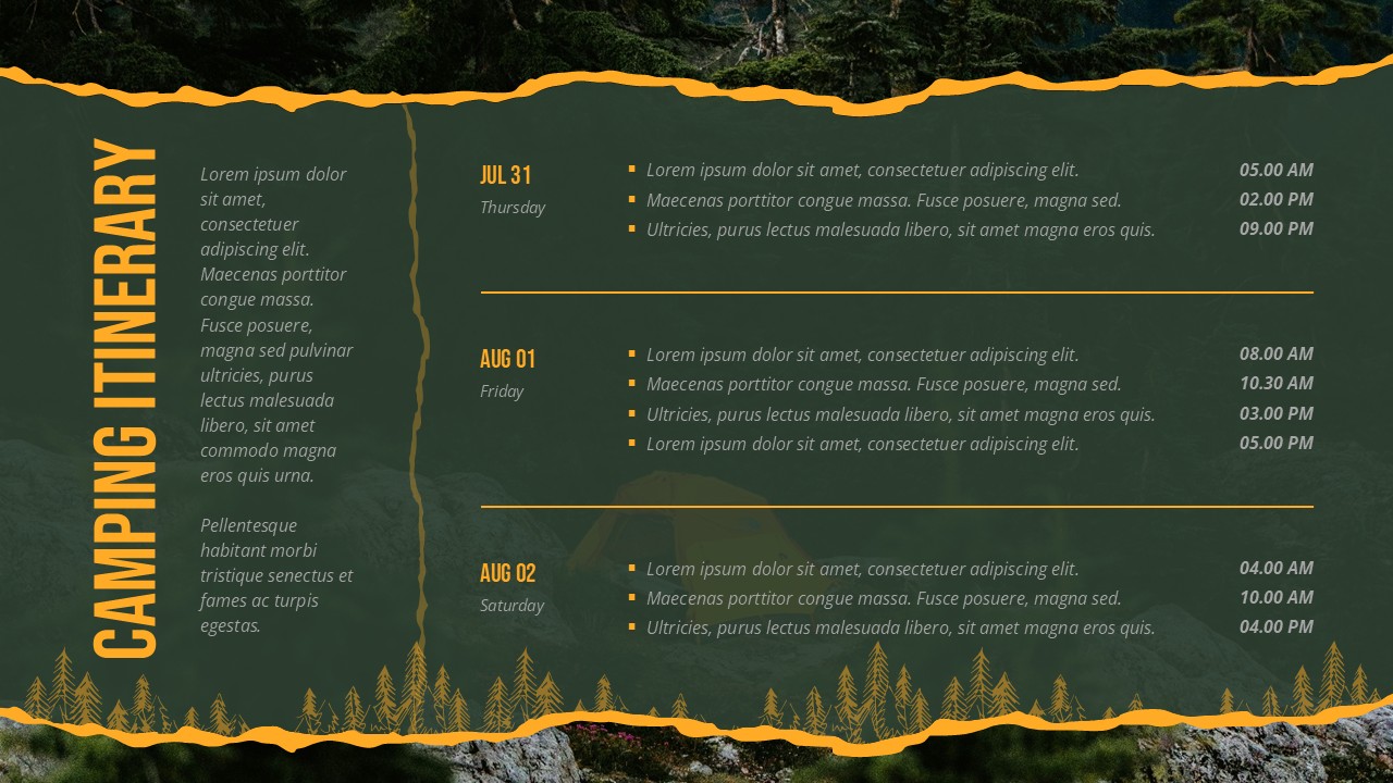 Forest Camping Adventure Camping Itinerary Presentation Template for PowerPoint and Google Slides