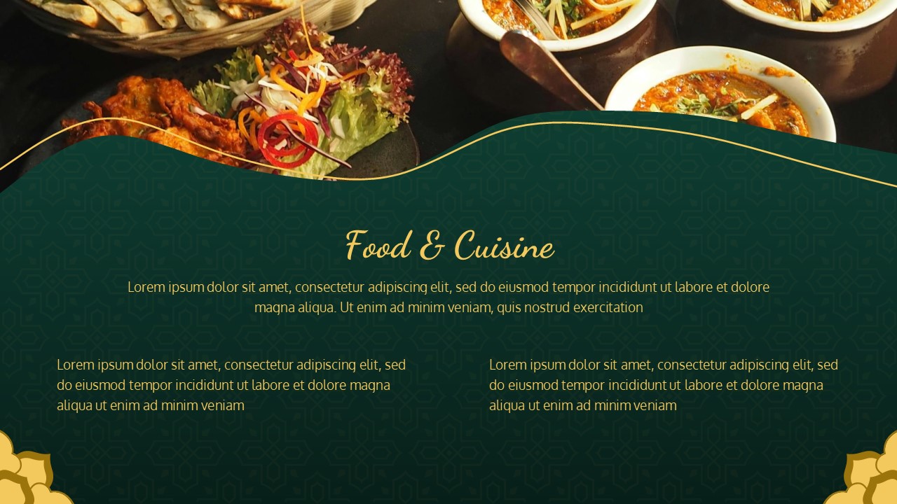 This template is inspired by the beauty of Moorish architecture and traditional Arabic arts. Its design elements include visual motifs like half-moons, mosque imagery, stars, and iconic Arabic textile patterns. These design choices make the template both culturally resonant and visually appealing, while conveying a sense of sophistication and respect for Arabic cultural heritage.