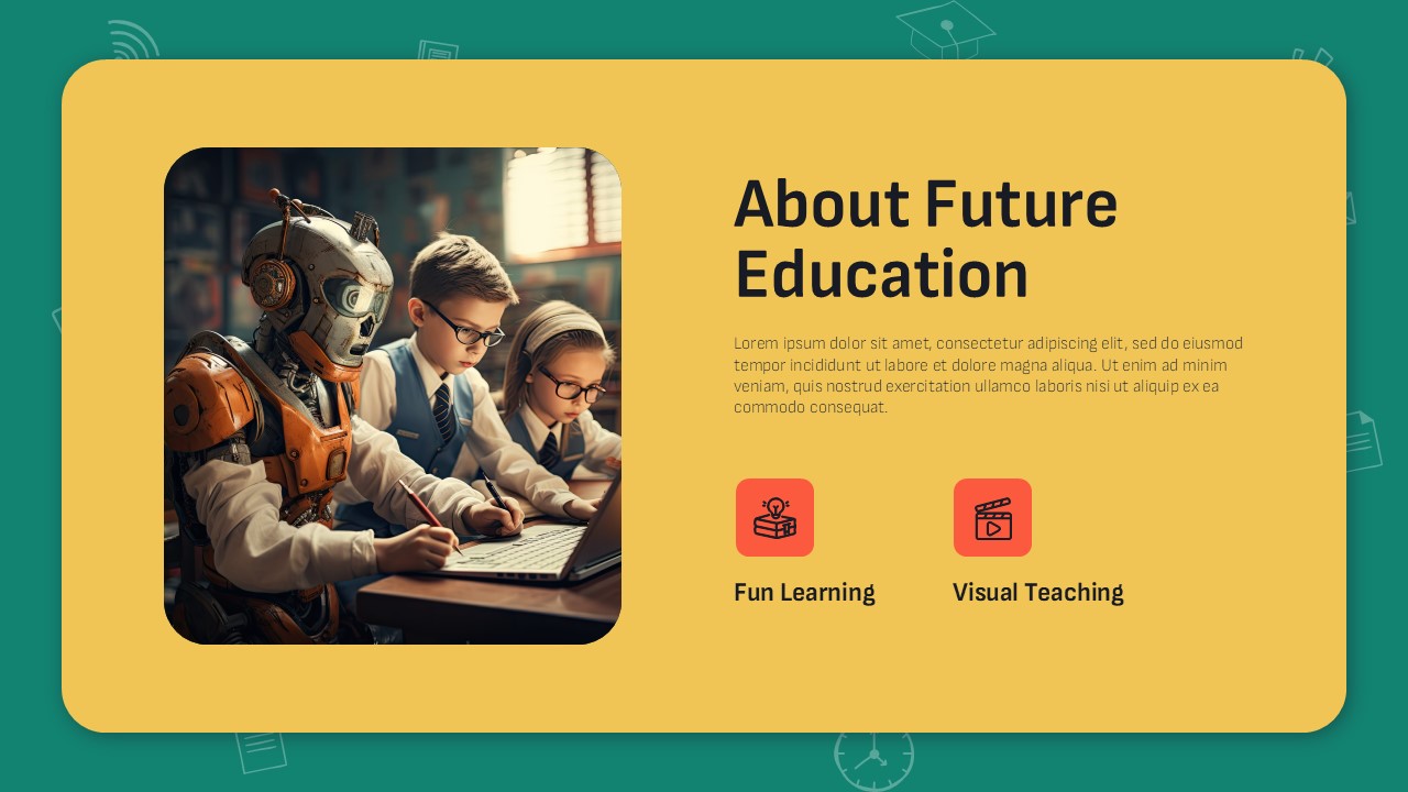 Cover Slide: Focuses on the future of education with thematic infographic icons.