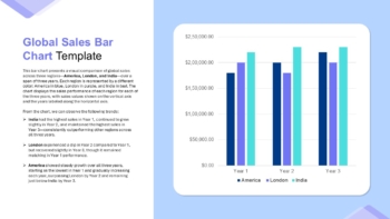 The featured bar chart compares global sales across three regions—America, London, and India—over a span of three years. Each region is color-coded for quick recognition (America in blue, London in purple, and India in teal), allowing audiences to easily identify trends. Alongside the chart, explanatory text highlights key insights, such as India’s consistent leadership in sales performance, America’s steady growth across all years, and London’s dip in Year 2 followed by recovery in Year 3.