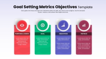 The Goal Setting Metrics Objectives Template is a professional and visually appealing presentation tool designed to simplify the process of defining, aligning, and tracking organizational or personal goals. Built with a modern design, this template highlights four essential components of strategic planning: Purpose & Vision, Goals, Objectives, and Metrics. Each section is presented with clear visual blocks, making it easy to communicate ideas in a structured and impactful way.