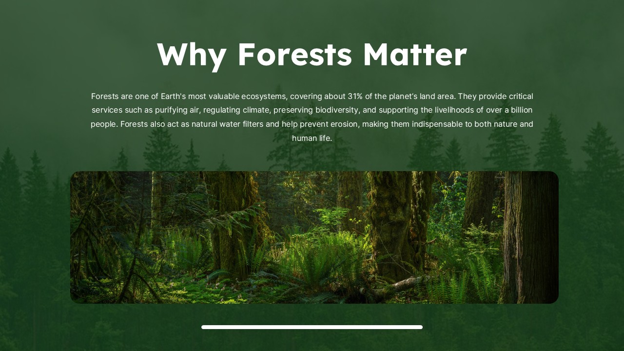 - Cover Slide: Dense forest visual to set a calming yet impactful tone