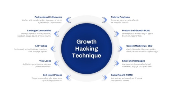 - Circular Flow Design: The template places Growth Hacking Technique at the center, surrounded by various growth strategies, providing a visual representation of how these techniques work together in a cohesive cycle.