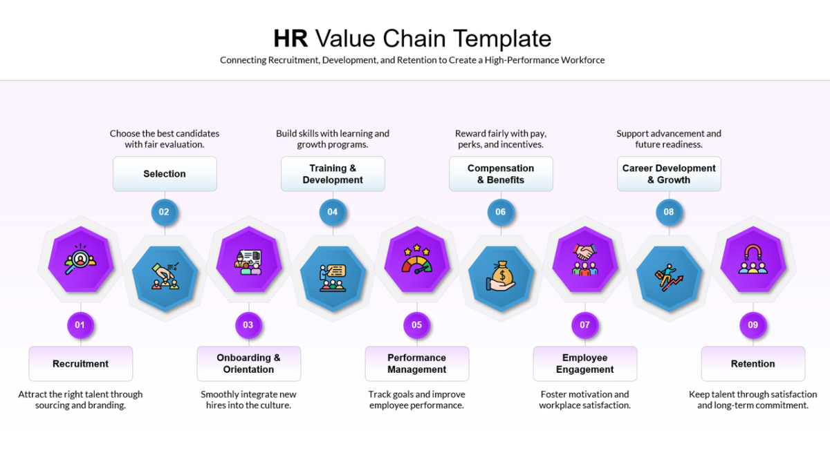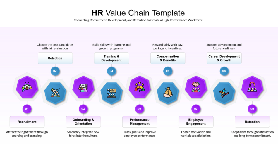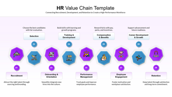 By using this HR Value Chain template, organizations can better align talent acquisition, development, and retention efforts—ultimately driving productivity, engagement, and long-term success.