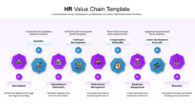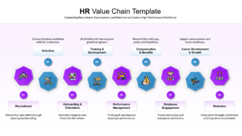 The HR Value Chain Strategy Template is a professionally designed presentation tool that helps organizations visualize and optimize every stage of the employee lifecycle. Structured as a clear, step-by-step flow, this template connects key HR functions—from recruitment to retention—ensuring alignment between talent management practices and overall business goals.