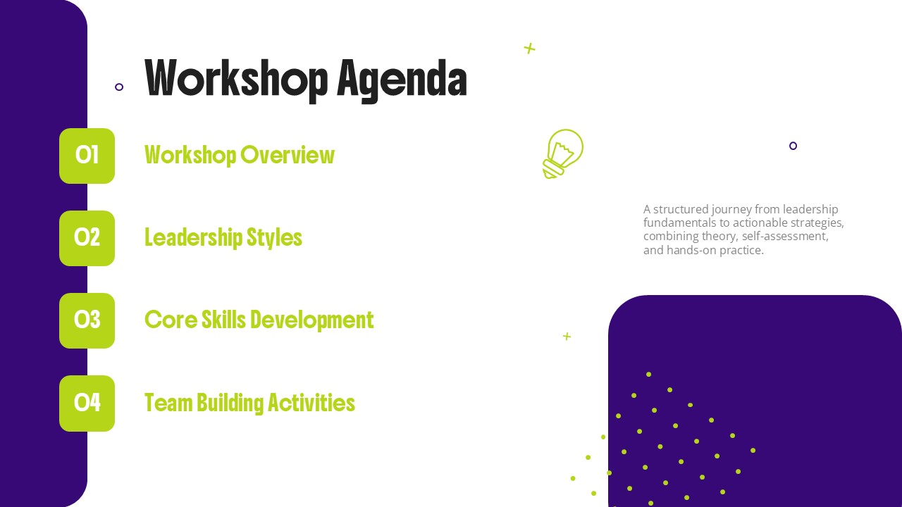 The Leadership Development Workshop Template is a modern, professional, and visually striking presentation design created to support leadership training, executive education, and personal development sessions. Featuring a sleek combination of deep purple and lime green, this template conveys both authority and creativity — ideal for inspiring leaders and teams alike.