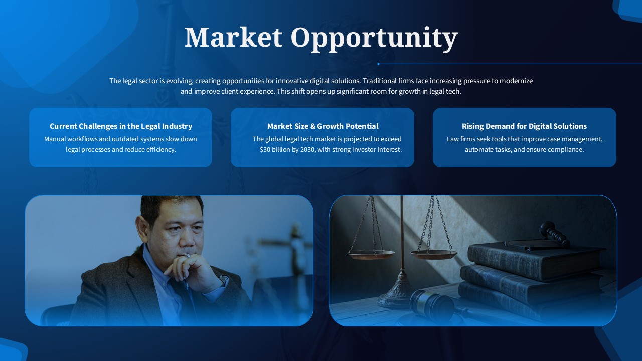 The template begins with a bold cover slide to introduce the brand or topic. The introduction slide sets the context for the presentation. Market opportunity outlines the potential growth areas for legaltech solutions. Problem statement defines the current gaps in the legal industry, followed by our solution to highlight the proposed service or technology.