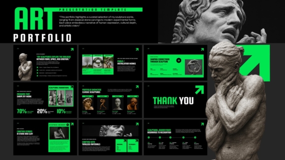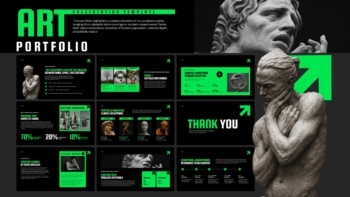 The Modern Art Sculpture Portfolio Presentation Template is a bold, visually immersive design created for artists, sculptors, and creative professionals who want to present their work with clarity, confidence, and contemporary appeal. Built around a striking dark theme accented with vibrant green highlights, this template draws immediate attention while maintaining a refined, gallery-like atmosphere that complements sculptural art and fine visual storytelling.