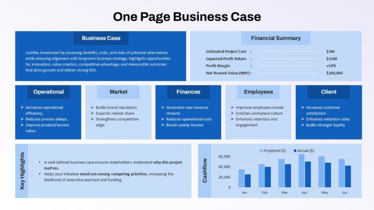 This one-page layout features sections for the Business Case summary, Financial Overview, Operational Goals, Market Opportunities, Employee Benefits, and Client Impact, along with a financial chart for projected versus actual cash flow. It provides a snapshot of essential metrics—such as estimated costs, expected returns, profit margins, and NPV (Net Present Value)—making it an ideal tool for stakeholder meetings, executive reviews, and funding discussions.