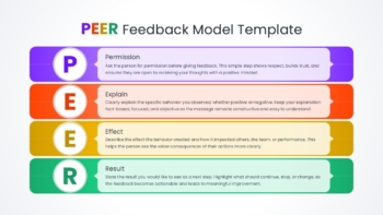 The PEER Feedback Model Presentation Template is a professionally designed slide deck created to help individuals and organizations deliver structured, respectful, and impactful feedback. Built around the widely recognized PEER framework—Permission, Explain, Effect, and Result—this template simplifies feedback conversations while ensuring clarity, empathy, and actionable outcomes. Its clean layout, balanced use of color, and logical flow make it an ideal tool for both formal and informal communication settings.