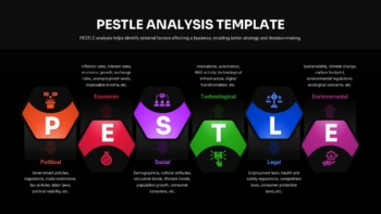 Featuring a sleek dark theme combined with bold color-coded segments, the template ensures each PESTLE dimension stands out while maintaining a cohesive and modern aesthetic. The hexagonal layout visually reinforces balance and clarity, making it easy for audiences to understand how different external forces interact and impact overall business strategy. Each section is supported by intuitive icons and concise explanatory space, allowing presenters to focus on insights rather than design work.