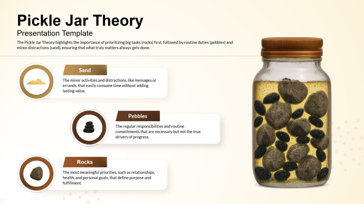 Ideal for professional settings, team workshops, personal development sessions, or classroom training, this template serves as a practical framework for fostering focus, balance, and efficiency. Whether you’re designing a corporate productivity seminar or personal coaching presentation, this Pickle Jar Theory Template ensures your message resonates clearly and leaves a lasting impression.
