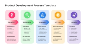 Streamline your product planning and execution presentations with this professionally designed Product Development Process Template, available for both PowerPoint and Google Slides. This visually intuitive slide clearly outlines the five essential stages of product development—Concept, Research, Analysis, Develop, and Launch—in a step-by-step format that supports clear communication and strategic decision-making.