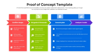 The Proof of Concept (PoC) Template is a structured and professional presentation tool designed to help teams validate ideas, test feasibility, and assess the potential of a solution before full-scale implementation. This template provides a clear roadmap divided into four essential phases: Confirm Scope, Set Goals & Timescale, Execute Plan, and Analyze & Scale.