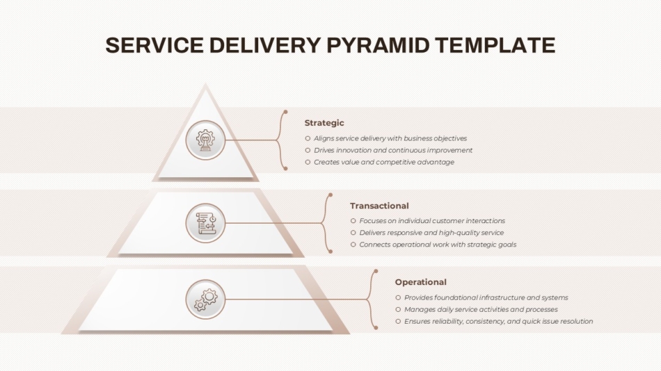 - Three-Pyramid Structure: The template is divided into three key levels, each representing a different aspect of service delivery: