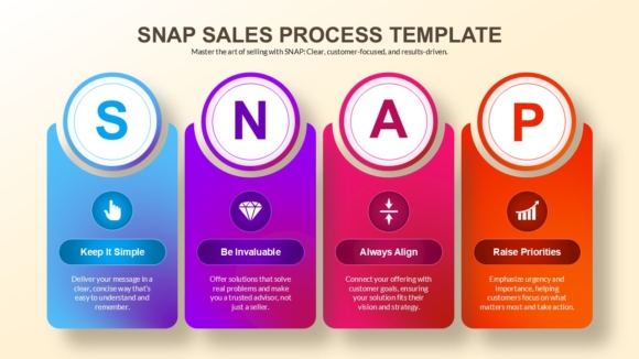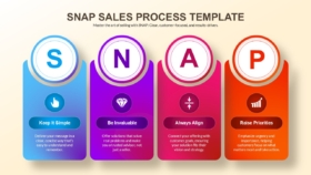 The Snap Sales Process Template is a structured presentation slide design built to present customer-focused sales messaging using a four-stage visual format. The layout highlights four core SNAP stages using color-coded vertical sections with supporting icons and short explanatory text. The template is designed to help present sales approaches, customer communication strategies, and sales training material in a clear visual structure. It includes sections suitable for explaining sales messaging, customer value positioning, and priority setting in sales conversations. The visual structure supports presentations that require step-based sales communication. The template is suitable for internal sales training, sales strategy reviews, or client-facing sales methodology presentations. The design supports the use of short text blocks combined with icons and headings.