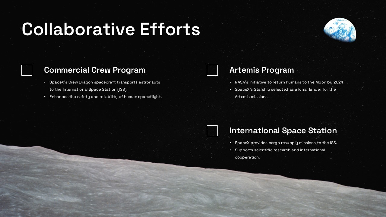 Comparison Slide: Draws parallels between NASA and SpaceX, emphasizing collaborative efforts.