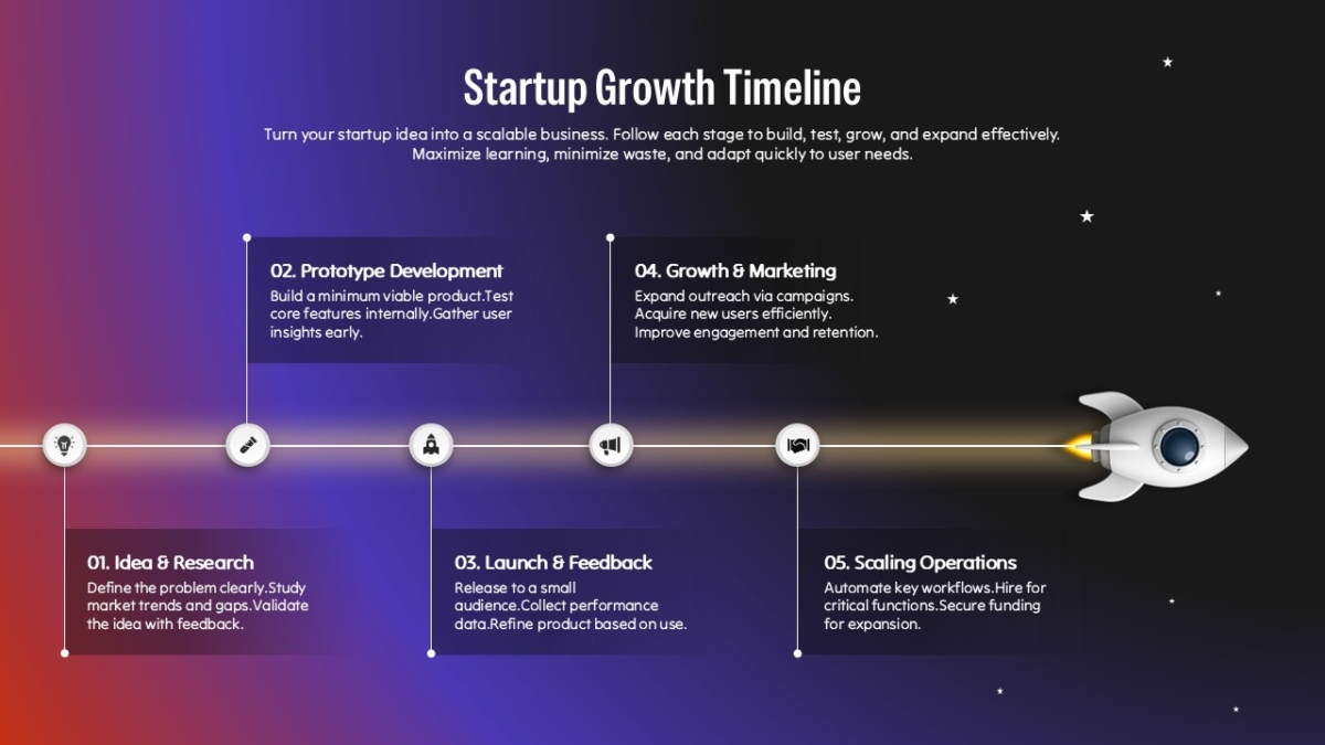Finally, the timeline concludes with Scaling Operations, where businesses focus on automating workflows, building efficient teams, and securing funding to support expansion. Each stage is represented visually along a rocket-inspired timeline, symbolizing growth, innovation, and forward momentum.