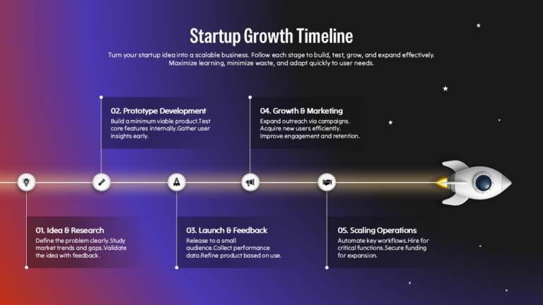 The timeline begins with Idea & Research, highlighting the importance of identifying problems, analyzing market trends, and validating concepts with real feedback. Next, the template illustrates Prototype Development, emphasizing the creation of a minimum viable product (MVP), testing features, and gathering early user insights. This stage ensures startups build on a solid foundation before advancing further.