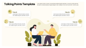 Each talking point is accompanied by a unique icon and bold title section, making it easy to distinguish between subjects. The template’s soft color palette and approachable design make it suitable for both formal and informal settings. Whether you’re hosting a one-on-one review, client briefing, or training session, this slide supports clarity and audience engagement.