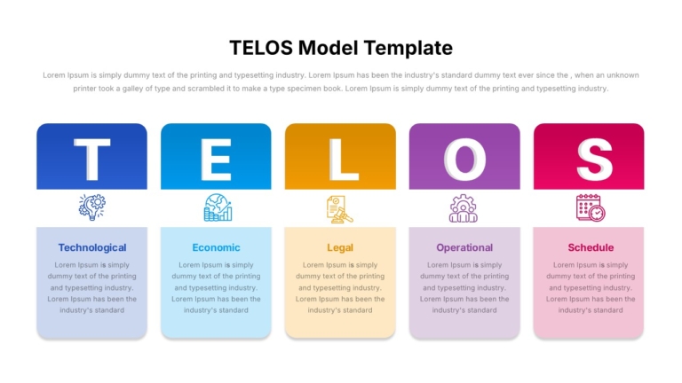 This ready-to-use design is ideal for professionals who need to present structured feasibility studies, project evaluations, or risk assessments. Its clean layout, bold typography, and smart use of colors make the template easy to adapt across industries. Whether you are a project manager, consultant, or business strategist, the TELOS Model Template ensures clarity in communication and credibility in decision-making.